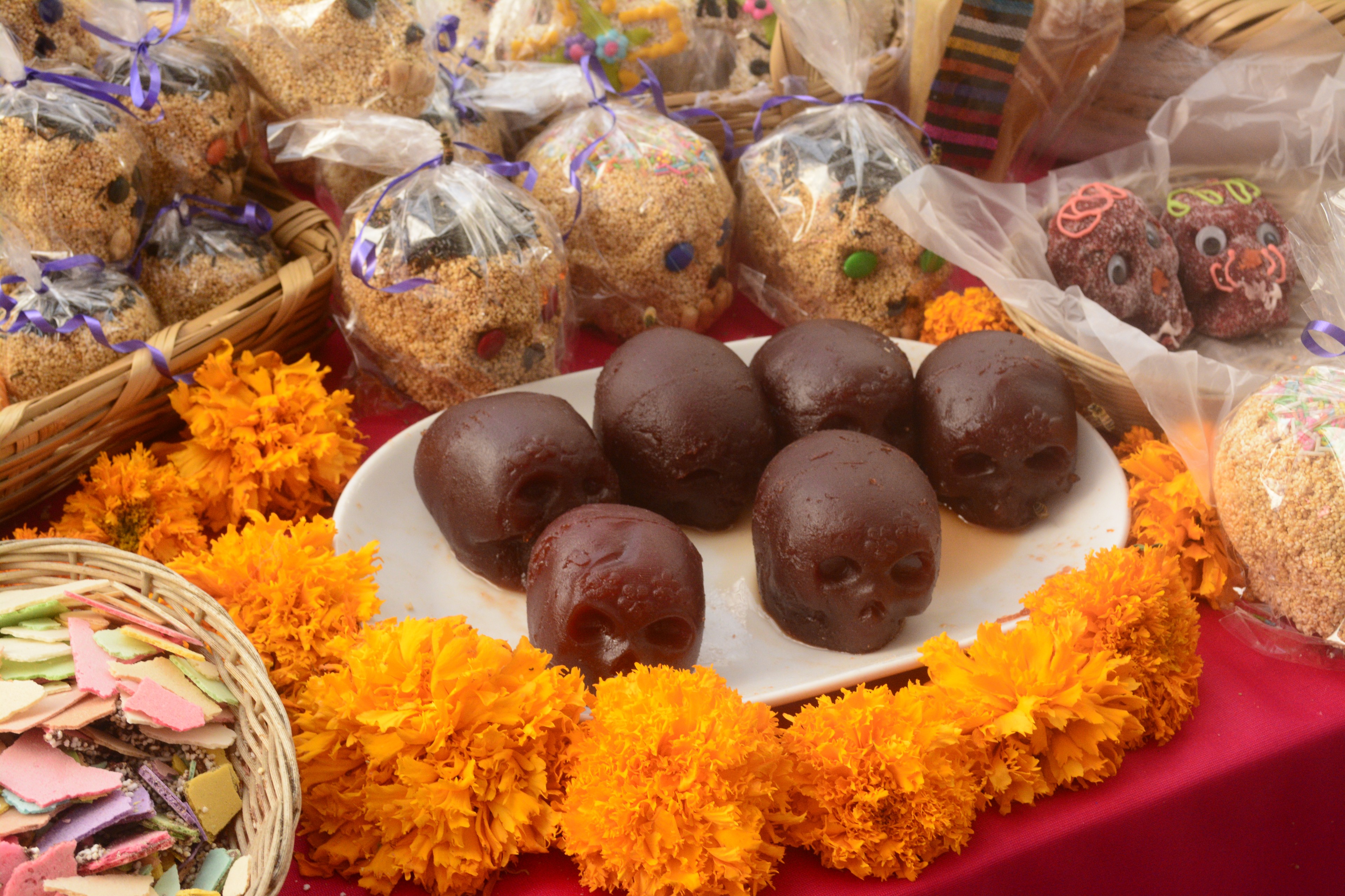 Otro elemento básico es la calavera de azúcar. Una escultura de azúcar decorada de forma adornada con forma de calavera que puede ser una hermosa decoración o un dulce regalo. Vienen en variedades comestibles y no comestibles. Las calaveras de azúcar más decorativas a menudo contienen un espacio para escribir el nombre de un ser querido fallecido para colocarlo encima de la Ofrenda. La versión comestible es más simple y generalmente está hecha de un tipo de azúcar más suave. Los cráneos comestibles también se pueden encontrar en una versión de chocolate, y las panaderías y confiterías de todo el país hacen pasteles en forma de calaveras, galletas e incluso gomitas para las vacaciones.